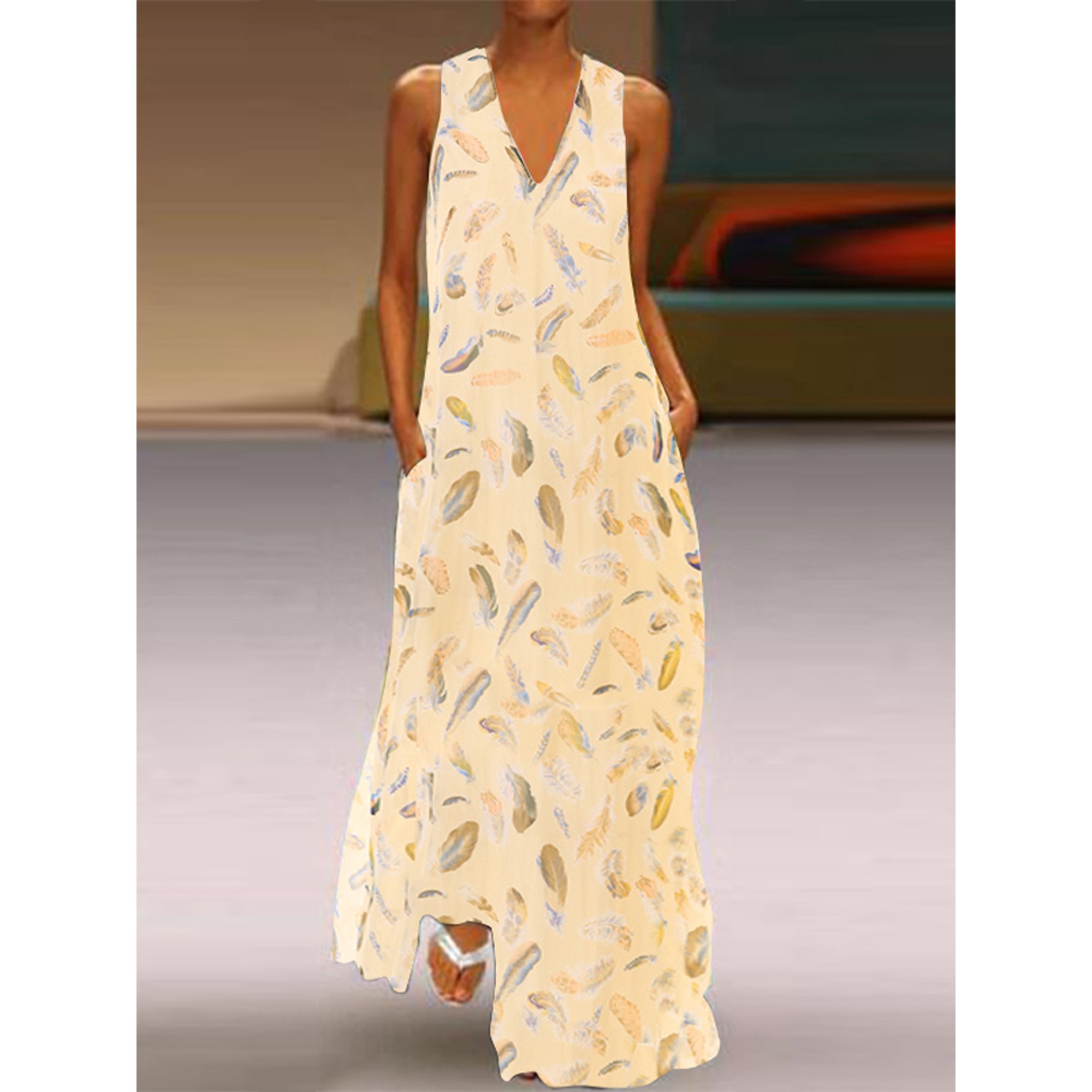 Zanzea Women Sleeveless Cocktail Long Maxi Dress Feather Print