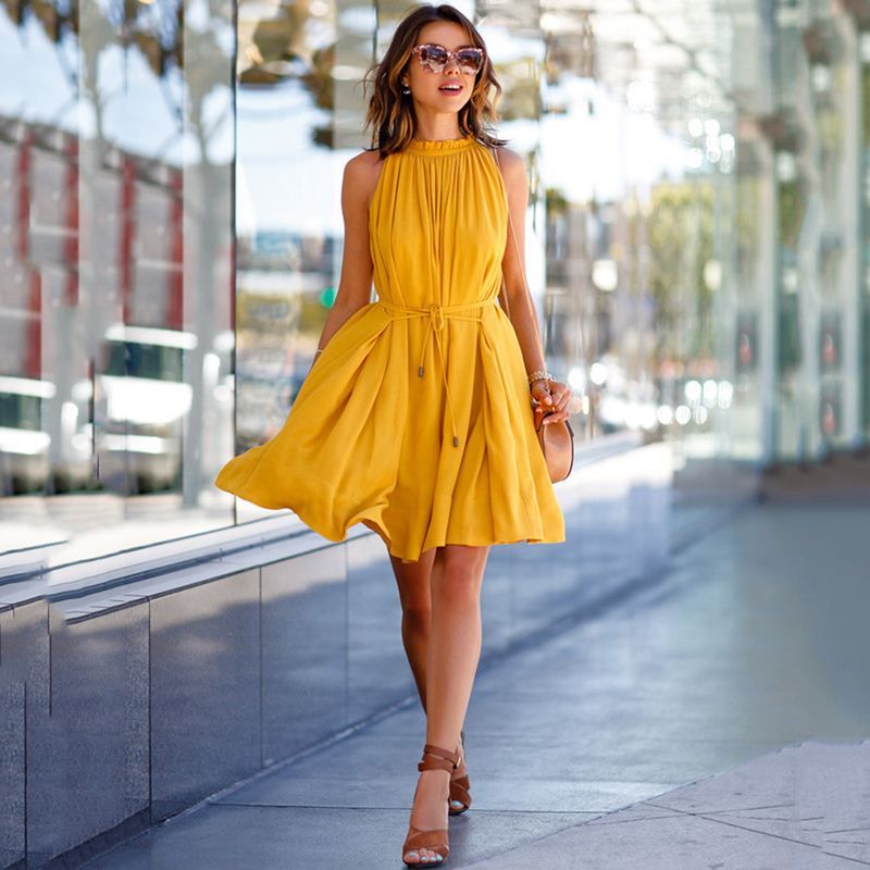 Woman Summer Dress 2018 Yellow Brief Sleeveless Plain Lace Up