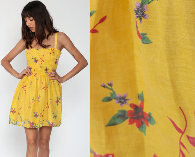 Floral Sundress Smocked Mini Dress 70s Yellow Hippie Boho Sun